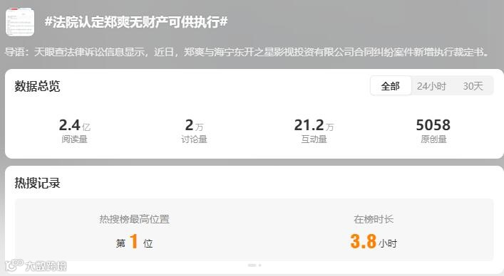 今日,演员郑爽相关话题,又一次在互联网上刷屏,截至券商中国发稿,相关话题阅读超过2.4亿次,讨论量超过2万条。