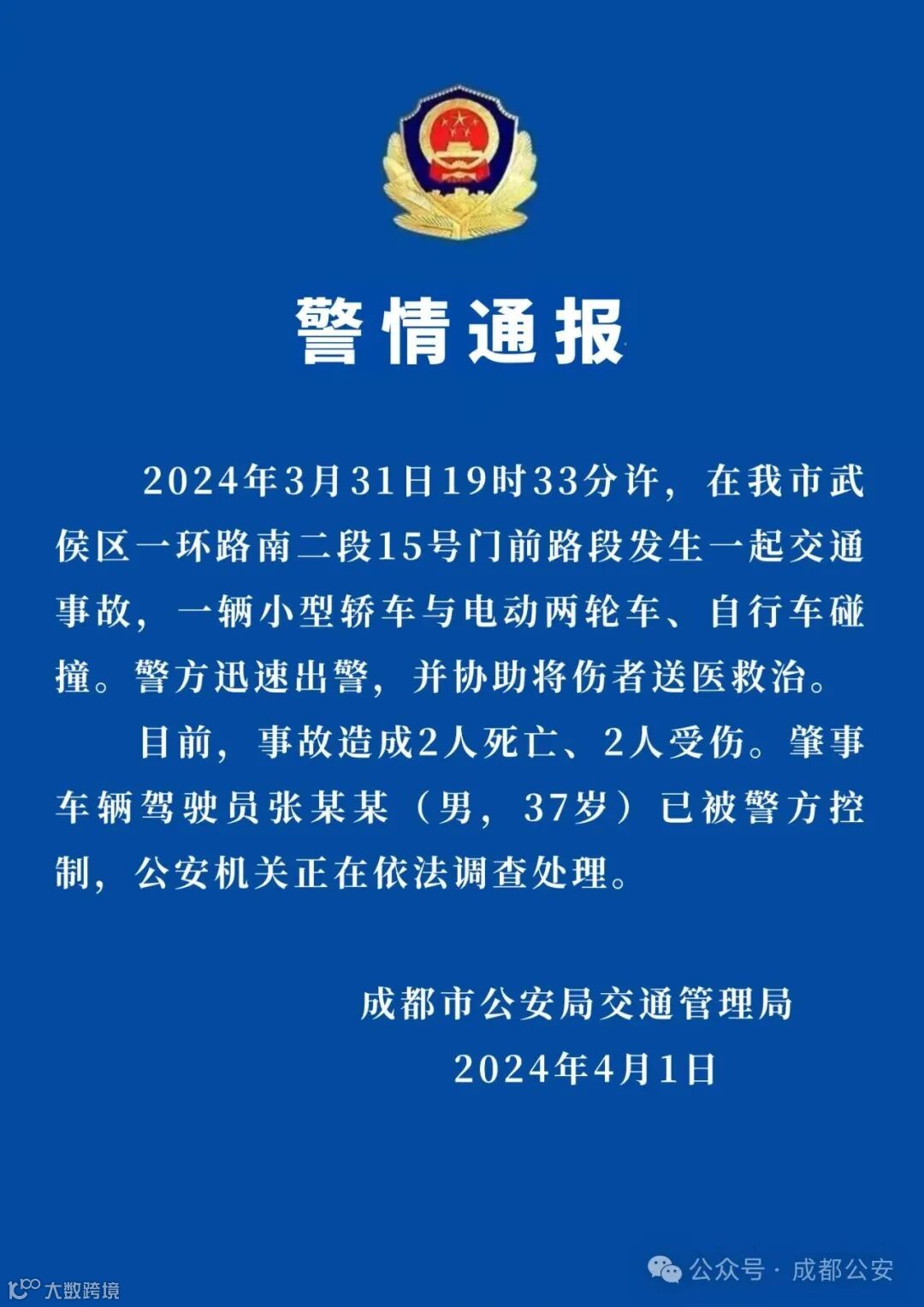 4月1日凌晨,成都市公安局交通管理局通报“迈巴赫撞倒多人”:造成2死2伤,肇事司机已被警方控制。