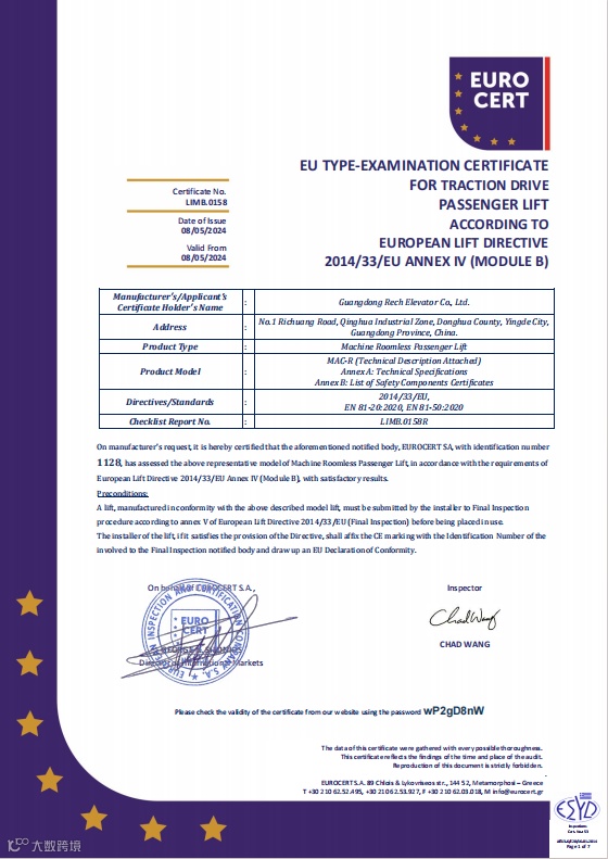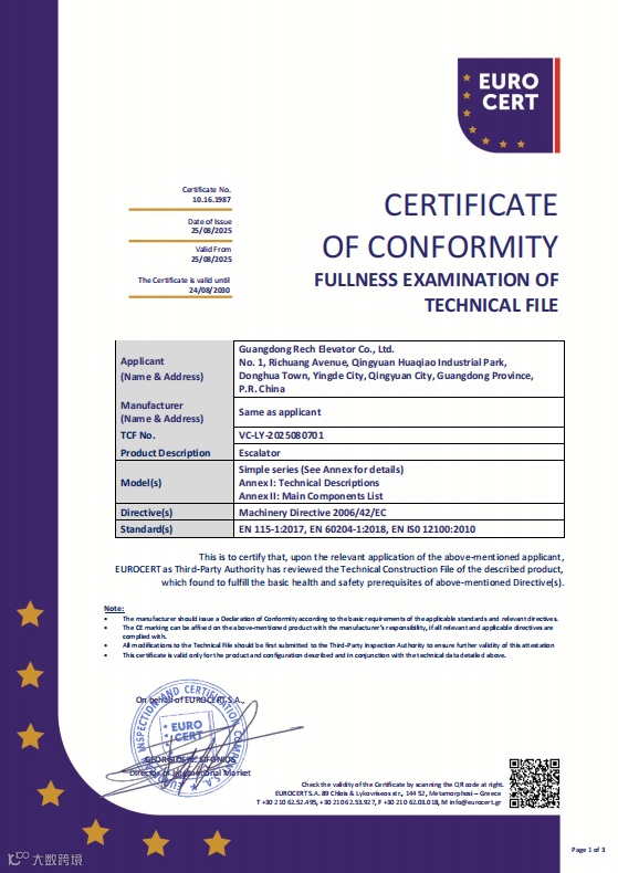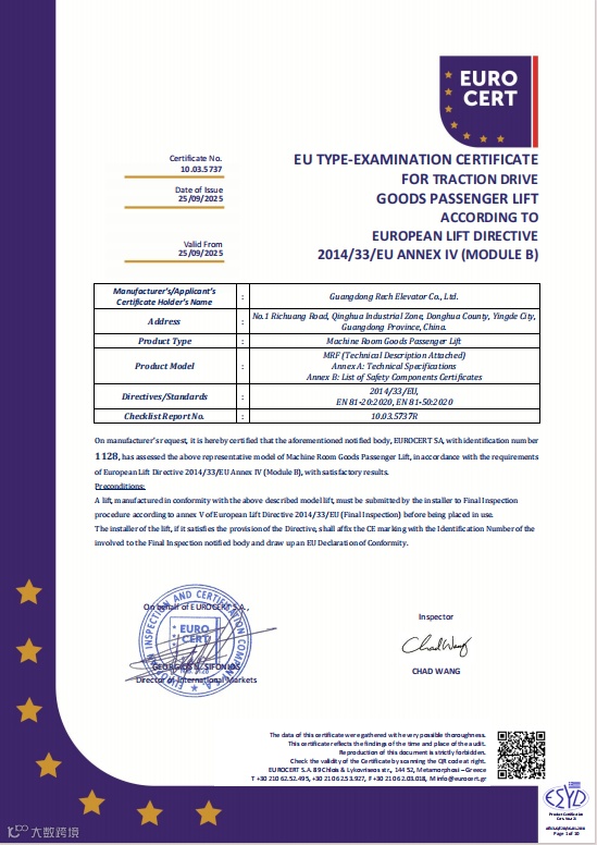 日创电梯凭借卓越的技术实力与严谨的制造标准,成功通过欧盟CE认证(2014/33/EU指令),标志着我们的产品在安全性、可靠性和环保性能上全面符合欧盟最高要求!