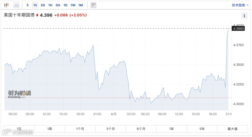 与此同时,美国国债抛售加剧,其中10年期美国国债收益率从数据公布前的4.329%最高跃升至4.405%;两年期国债收益率从4.66%最高升至4.704%。