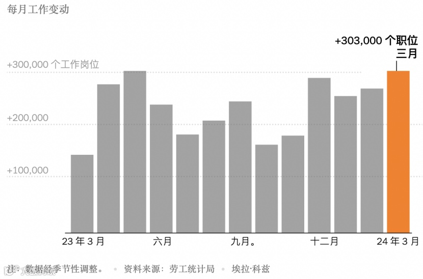 北京时间4月5日晚间,美国劳工统计局发布了最新的非农就业数据报告,其中显示,美国3月非农就业人数超预期激增30.3万人,创下去年5月以来的最大增幅,大超市场预期(增加21.4万人),前值增加27.5万人修正为27万人。这是美国就业岗位连续39个月增长。