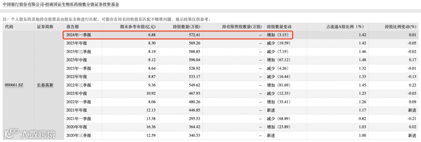 从基金持有的前十大流通股东情况来看,今年一季报显示,基金经理侯昊、许荣漫管理的指数基金招商国证生物医药A买进长春高新前十大流通股东第六位,持股比例1.42%,市值6.88亿元。不过,受近几年整个医药大盘下跌的拖累,该产品的业绩表现不尽如人意,跑输沪深300,近1年期回报为-34.26%,近2年期回报为-44.68%,近3年下跌幅度达到60.68%。