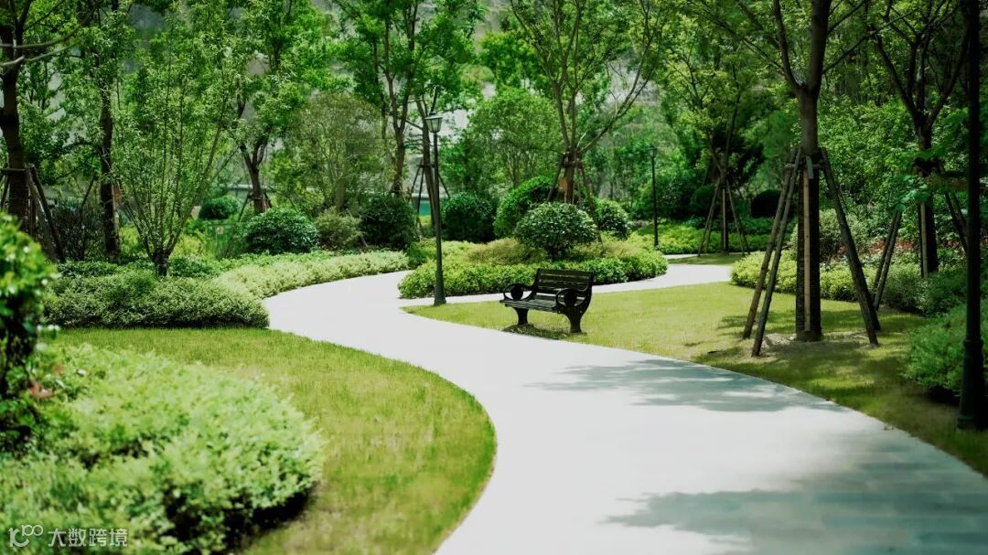 孩子在不远处的草坪上奔跑,老人在林荫下悠闲散步。