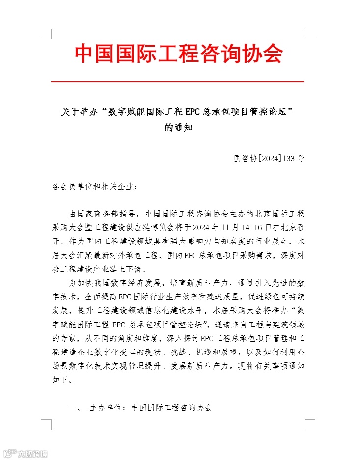 由国家商务部指导,中国国际工程咨询协会主办的北京国际工程采购大会暨工程建设供应链博览会将于2024年11月14-16日在北京召开。作为国内工程建设领域具有强大影响力与知名度的行业展会,本届大会汇聚最新对外承包工程、国内EPC总承包项目采购需求,深度对接工程建设产业链上下游。
