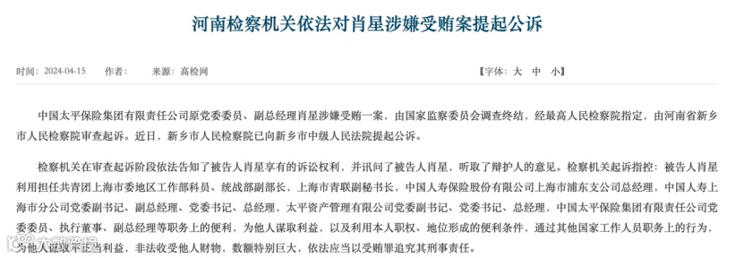 近日,中国太平保险集团原党委委员、副总经理肖星被提起公诉。