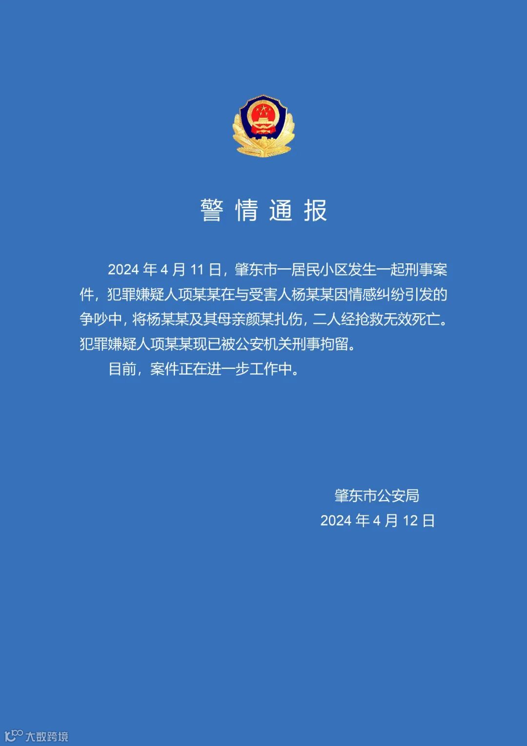 4月12日晚,黑龙江肇东市公安局发布警情通报称,4月11日,肇东市一居民小区发生一起刑事案件,犯罪嫌疑人项某某在与受害人杨某某因情感纠纷引发的争吵中,将杨某某及其母亲颜某扎伤,二人经抢救无效死亡。犯罪嫌疑人项某某现已被公安机关刑事拘留。目前,案件正在进一步工作中。