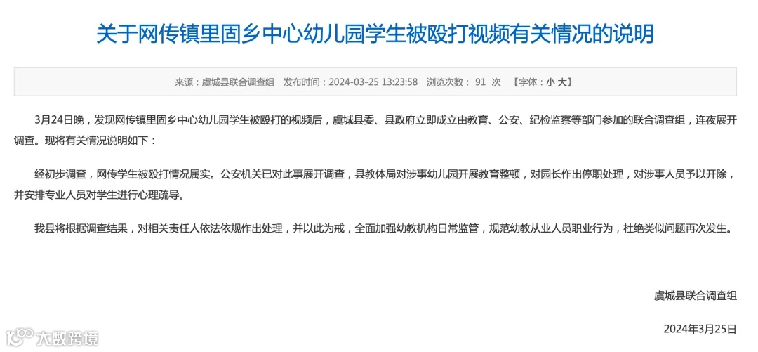 3月24日晚,发现网传镇里固乡中心幼儿园学生被殴打的视频后,虞城县委、县政府立即成立由教育、公安、纪检监察等部门参加的联合调查组,连夜展开调查。现将有关情况说明如下: