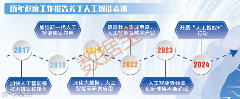 2017年的政府工作报告提出“加快人工智能等技术研发和转化”,到2018年“加强新一代人工智能研发应用”和2019年“深化大数据、人工智能等研发应用”,人工智能正慢慢从“研发”走向“应用”。2022年人工智能从“应用”成长为“产业培育”,当年政府工作报告提出“培育壮大集成电路、人工智能等数字产业,提升关键软硬件技术创新和供给能力”。到2024年,人工智能更是开始赋能各行各业,政府报告提出“开展‘人工智能+’行动”。