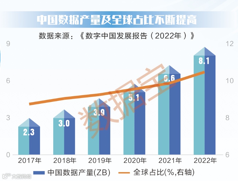 我国数据资源规模快速增长,《数字中国发展报告(2022年)》显示,2022年我国数据产量达8.1ZB,同比增长22.7%,全球占比达10.5%,位居世界第二。截至2022年底,我国数据存储量达724.5EB,同比增长21.1%,全球占比达14.4%。全国一体化政务数据共享枢纽发布各类数据资源1.5万类,累计支撑共享调用超过5000亿次。我国已有208个省级和城市的地方政府上线政府数据开放平台。2022年我国大数据产业规模达1.57万亿元,同比增长18%。