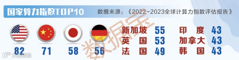 从目前算力规模来看,中国已处在世界第一梯队。国家互联网信息办公室发布的《数字中国发展报告(2022年)》显示,截至2022年底,我国数据中心机架总规模超过650万标准机架,近5年年均增速超过30%;在用数据中心算力总规模超180EFLOPS,位居世界第二。存力总规模超过1000EB(1万亿GB),国家枢纽节点间的网络单向时延降低到20毫秒以内,算力核心产业规模达到1.8万亿元。