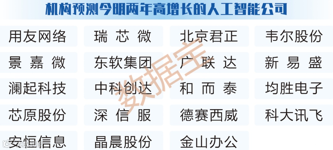 众多人工智能上市公司中,哪些公司未来业绩值得期待?证券时报·数据宝以中证人工智能产业指数(931071.CSI)(注:该指数在为人工智能提供基础资源、技术以及应用支持的公司中,根据人工智能业务占比和总市值的综合指标,选取50家最具代表性公司作为样本)为基础,根据5家以上机构一致预测,筛选出2024年、2025年净利润增速均有望超30%的公司,合计有19家入围。
