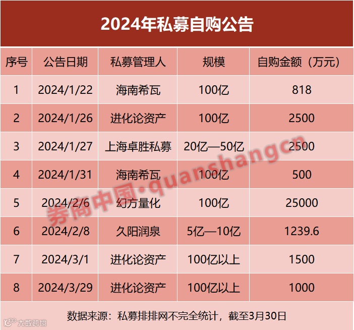 据不完全统计,截至3月30日,今年来一共有5家私募发布过自购公告,合计自购金额为3.51亿元。其中海南希瓦、进化论资产、幻方量化这3家为百亿私募,另外上海卓胜私募规模为20亿—50亿元,久阳润泉为5亿—10亿元私募。从自购金额来看,幻方量化年内自购2.5亿元居首,其次是进化论资产的0.5亿元。