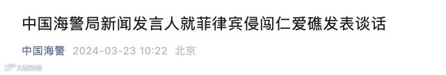 中国海警局新闻发言人就菲律宾侵闯仁爱礁发表谈话
