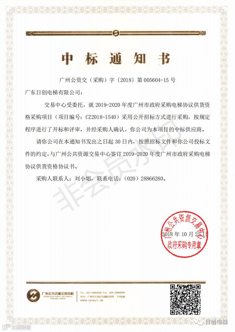 2018年10月25日,广东日创电梯有限公司中标2019-2020广州市政府采购电梯协议供应资格。