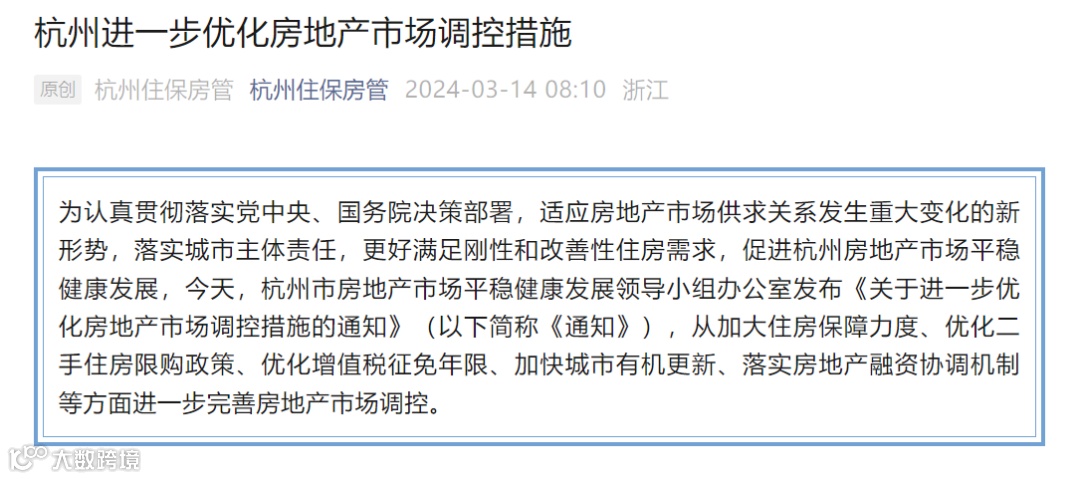 3月14日,杭州调整优化房地产政策,在杭州市范围内购买二手住房,不再审核购房人资格,二手房限购全面放开,同时,杭州市范围内个人出售住房的增值税征免年限统一调整为2年。