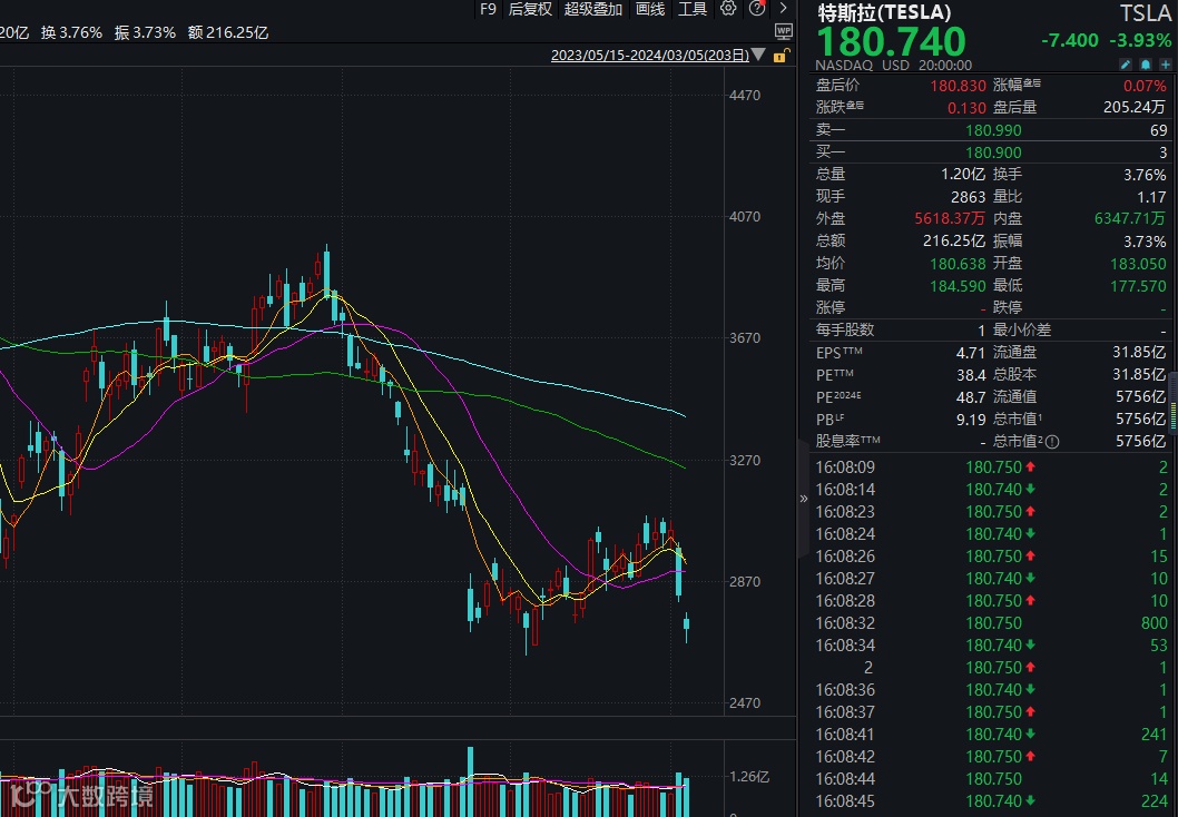 在上述报告发布的前一天,特斯拉的股价因其在中国市场的销量大幅下滑而暴跌7%。报告发布当天,即当地时间周二,特斯拉股价继续下挫,截至收盘时下跌3.93%报180.74美元/股,最新市值缩水至5756亿美元。仅用两个交易日的时间,特斯拉的市值就蒸发近700亿美元,折合人民币约5000亿元。