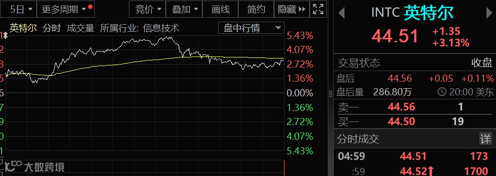 当地时间6日,英特尔股价一度大幅飙升近6%。