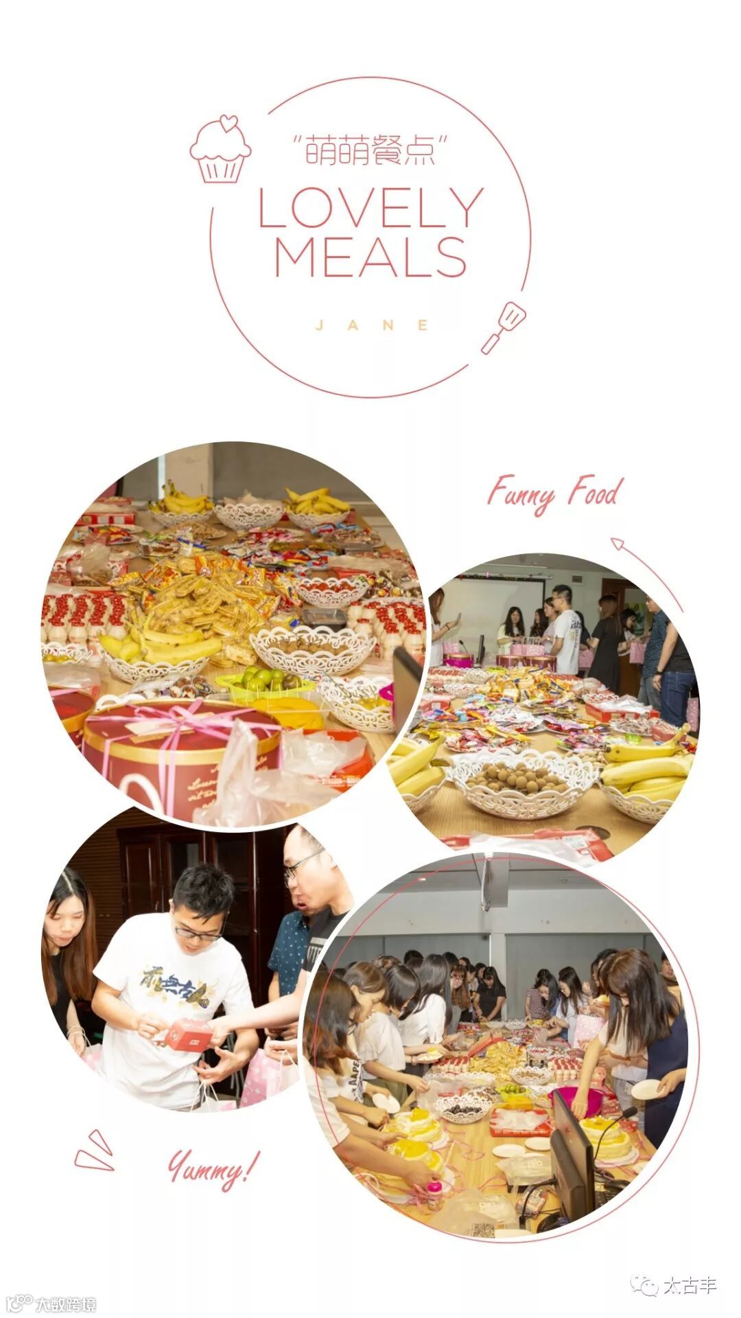 生日会上,全体员工品尝着寿星亲自切好的生日蛋糕还有一桌子的水果零食!