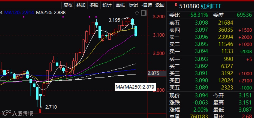 更为重要的是,市值近10万亿的红利资产今天贡献了较大跌幅。石油、煤炭、家电、电力等集体杀跌,银行ETF亦在技术上出现了见顶的走势。这类资产,放在之前都是防守型板块,但今天集体杀跌。值得注意的是,在此背景之下,港股依然表现不错。那么,究竟又发生了什么?