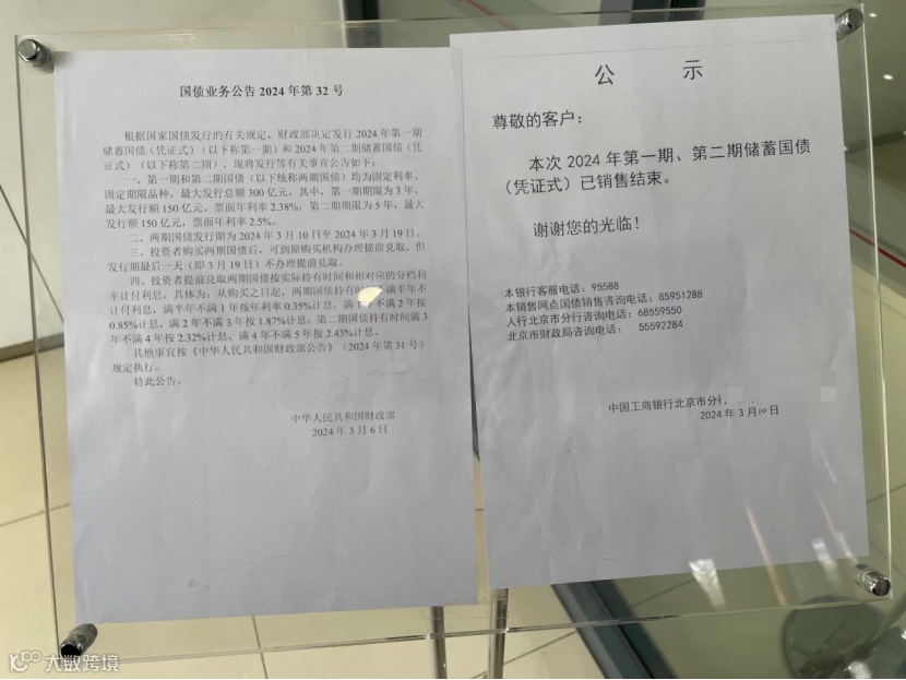 记者于当日下午前往北京一大行网点,该行已贴出告示,通知投资者两期国债销售已结束。