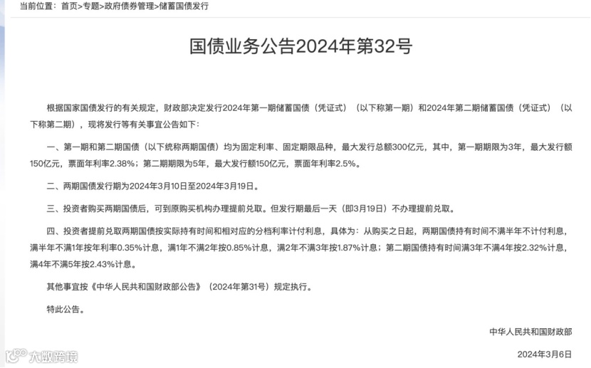 财政部公告显示,2024年第一期、第二期储蓄国债(凭证式)于3月10日至3月19日发行,两期国债均为固定利率、固定期限品种,最大发行总额300亿元,两期最大发行额各150亿元。其中,第一期期限3年,票面年利率2.38%;第二期期限5年,票面年利率2.5%。