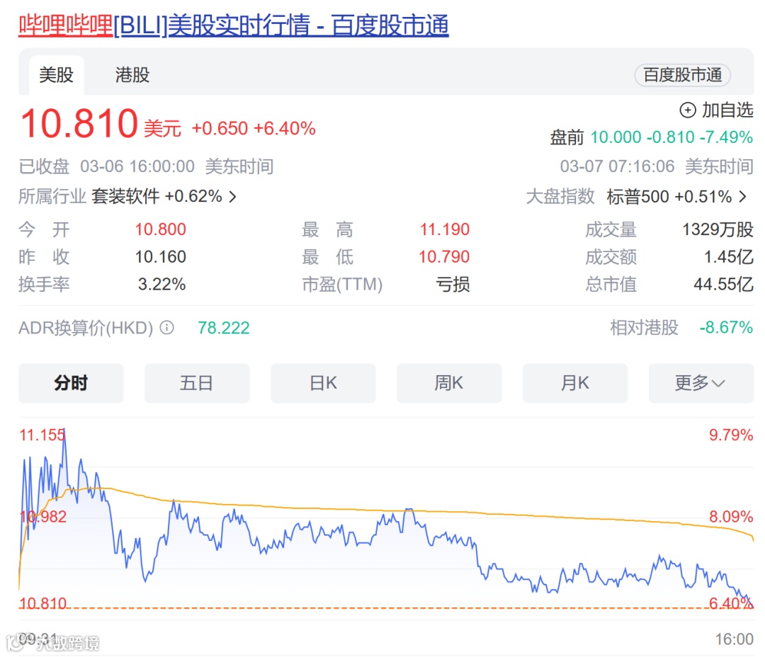 受消息影响,美股哔哩哔哩盘中一度大跌近8%,但随后跌幅收窄,截至收盘,股价跌1.94%。自今年年初以来,哔哩哔哩已经下跌13%。
