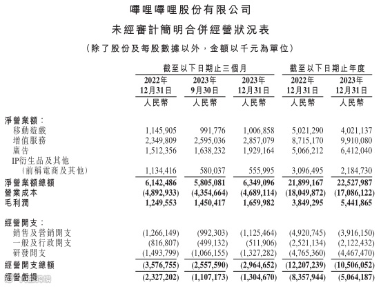 3月7日晚间,哔哩哔哩(NASDAQ: BILI,HKEX:9626;简称“B站”)公布了截至2023年12月31日的第四季度和全年未经审计的财务报告。