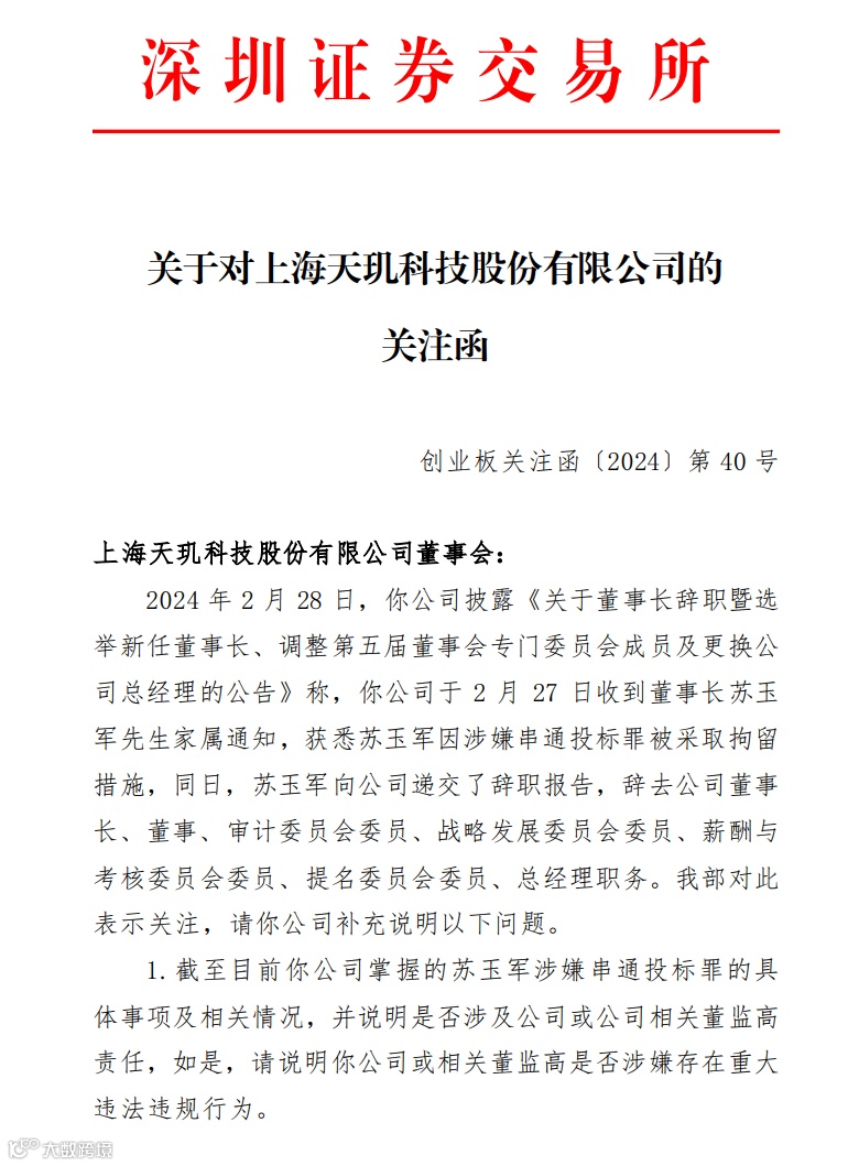 2月28日,天玑科技公布上述事项后,深交所创业板公司管理部向公司发出关注函。