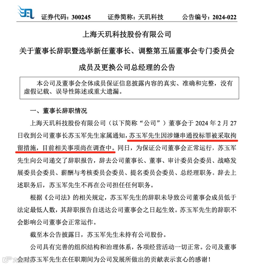 天玑科技公告提到,公司董事会于2024年2月27日收到董事长苏玉军家属通知,苏玉军因涉嫌串通投标罪被采取拘留措施。