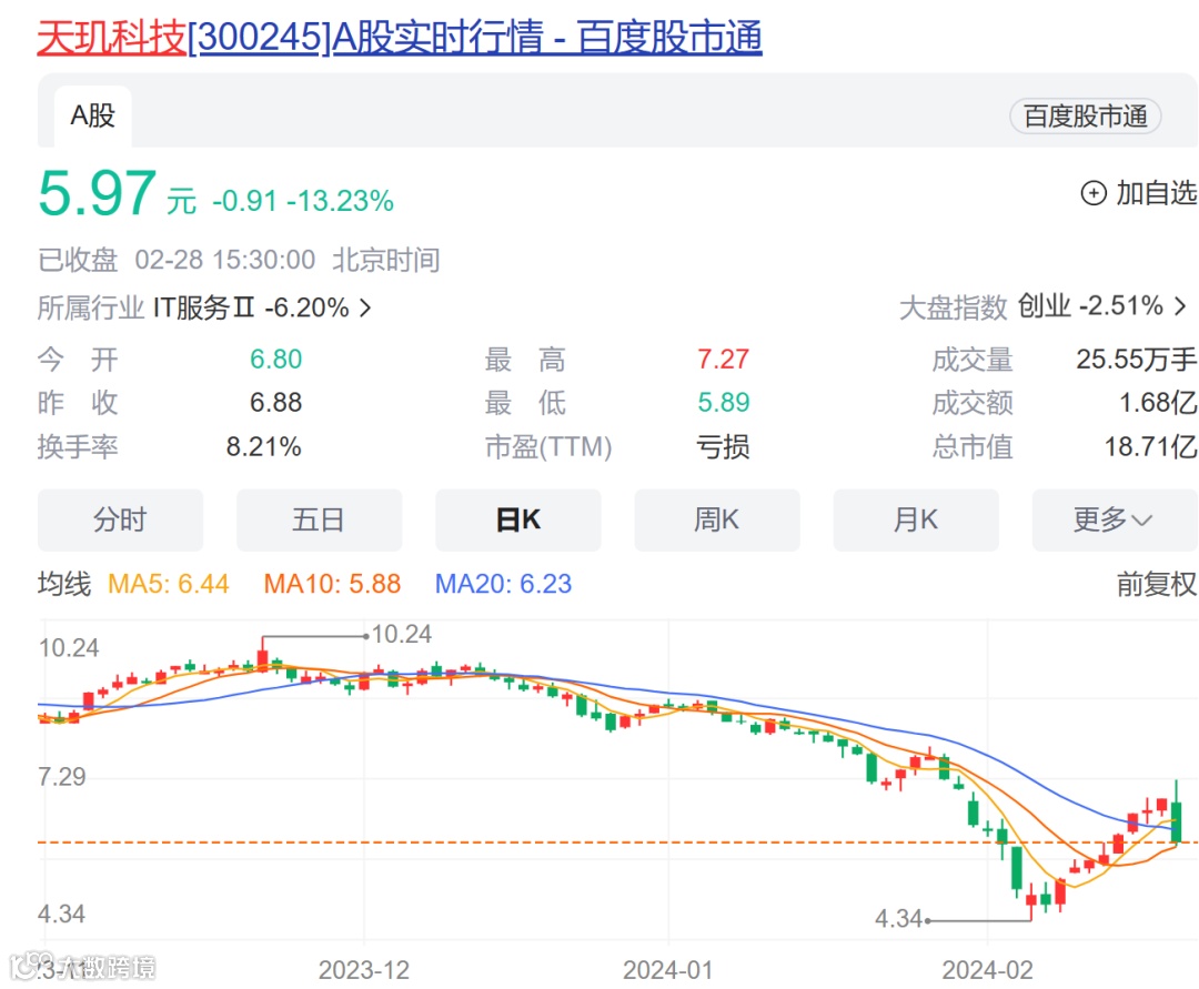 2月28日,天玑科技开盘后一度上涨逾4.5%,此后持续下跌。截至收盘跌幅达13.23%,市值18.7亿元。