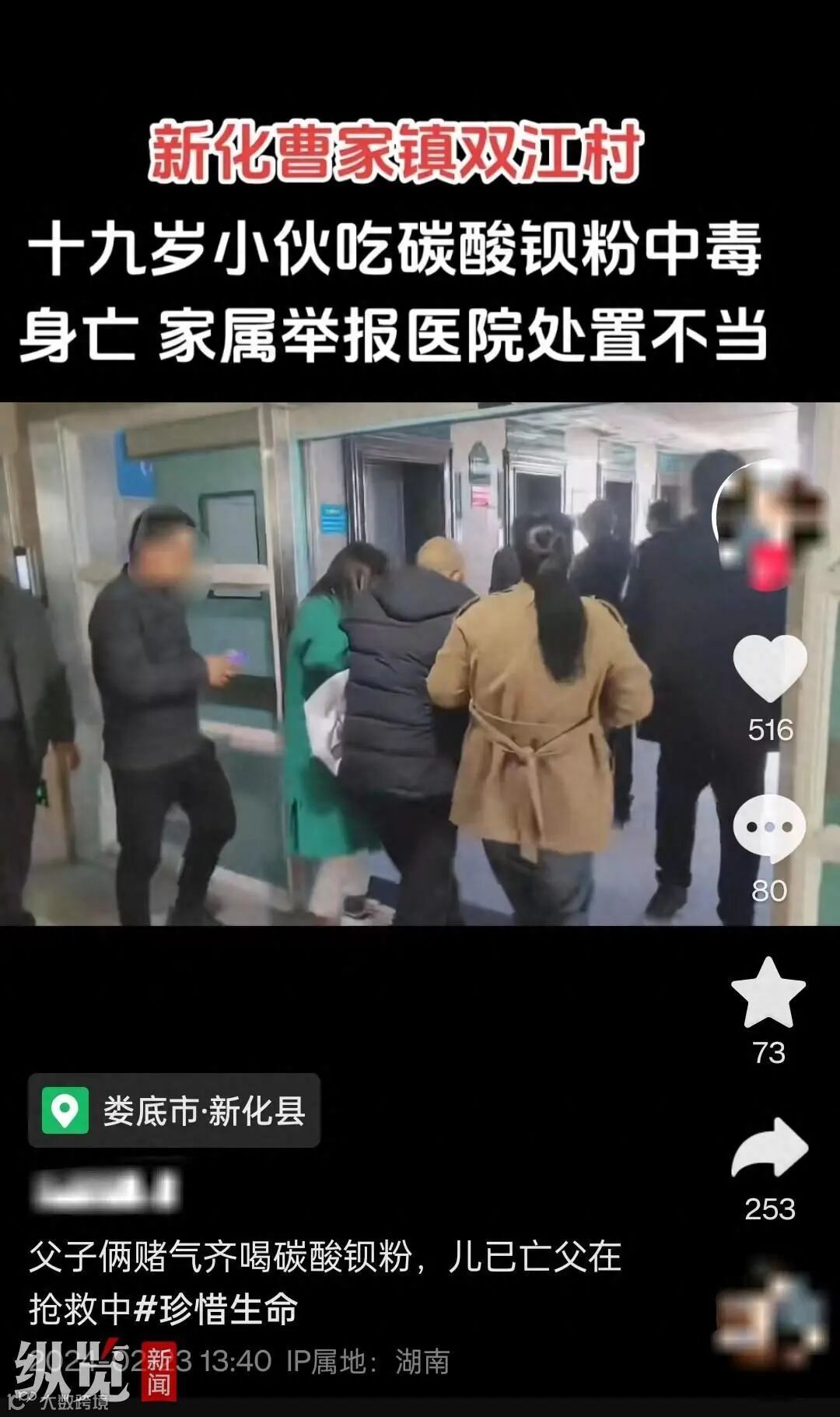 多位网友发文称事情发生在2月15日晚10点,新化县一对祝姓父子因吵架吃下碳酸钡粉末中毒,当晚家属就将两人送到了医院,最终父亲获救,儿子不治身亡。