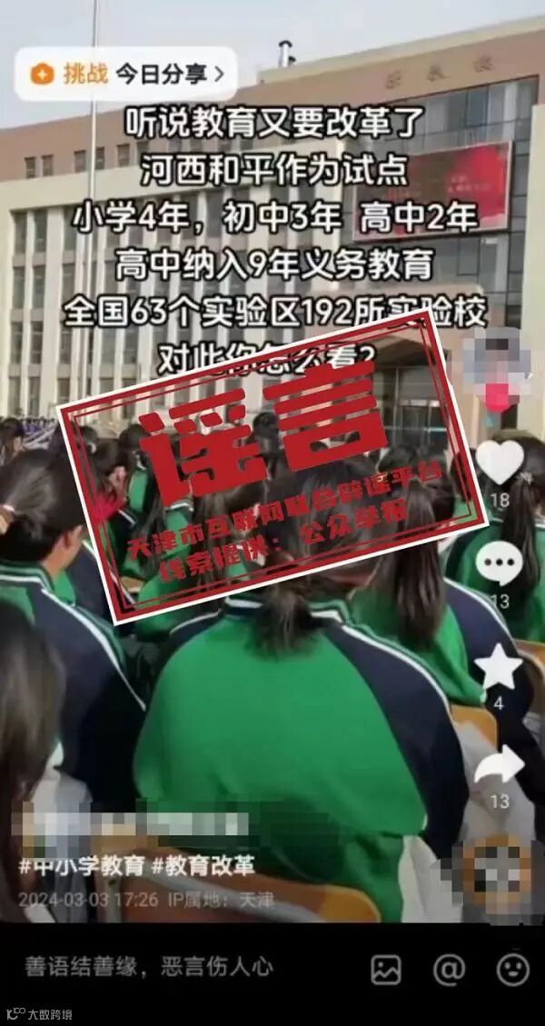 据“河西辟谣”公众号消息,近日,网传视频称“河西作为试点,小学4年,初中3年,高中2年,高中纳入义务教育”,引发网友关注。经与相关部门核实,真实情况为:河西区并未接到上级部门要求变更小学、高中学制、将高中纳入义务教育的工作要求。