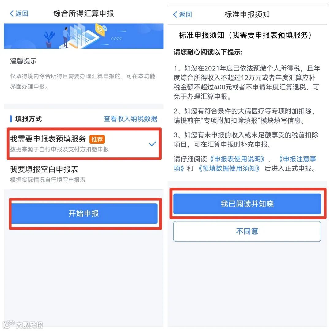 选择【我需要申报表预填服务】,仔细阅读【标准申报须知】后进入下一步: