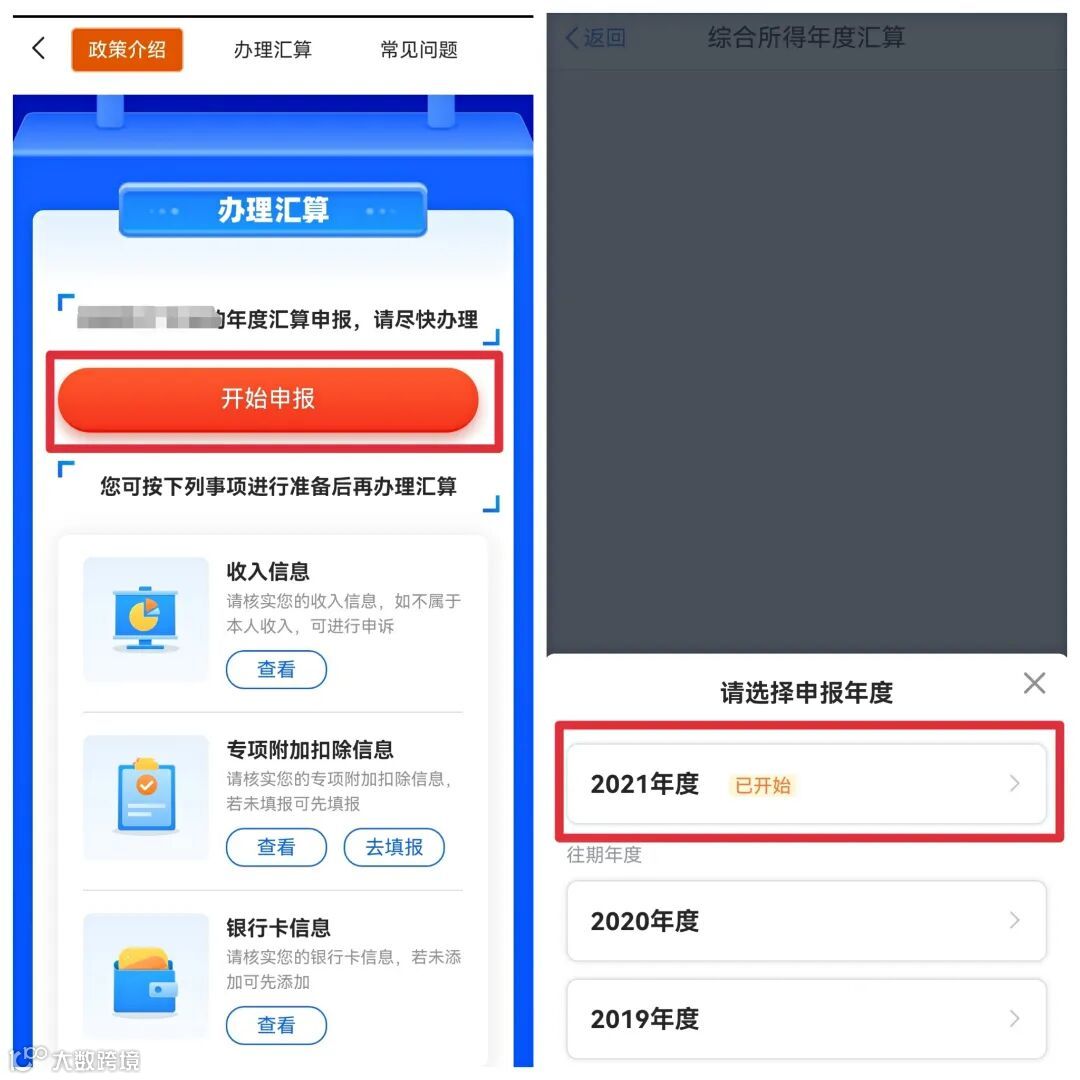 1、从首页中间【2021综合所得年度汇算】—【开始申报】进入;