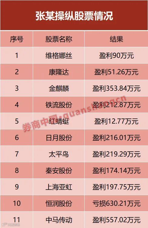 券商中国记者梳理发现,张某操纵的11只股票,竟然有10只是盈利的,只有1只亏损,堪称“股神”。通过操纵11只股票,张某实现盈利2085万元。证监会认定其构成操纵证券市场行为。张某被没收违法所得2085万元,并被处以6255万元罚款。