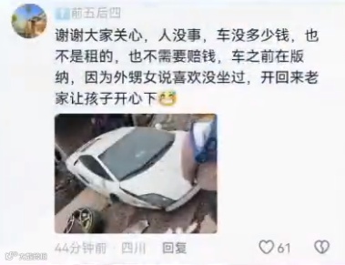 结果在乡村道路上行驶时,由于路况复杂和车速较快,车辆失控撞上路边的石头,导致车辆严重损坏。目击者称,车辆的前轮已经脱落,后轮则掉进了沟里,几乎可以确定这辆豪车已经报废。幸运的是,该男子并未在事故中受伤。