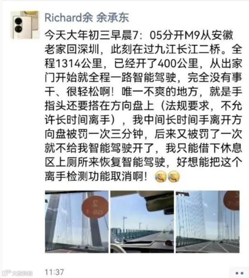 按照余承东的说法,今天早晨驾驶问界M9从安徽老家回到深圳,在上午11时过后抵达九江长江二桥,全程1314公里,已经开了400公里。其从出家门开始“全程一路智能驾驶”,直呼“完全没事干,很轻松”。