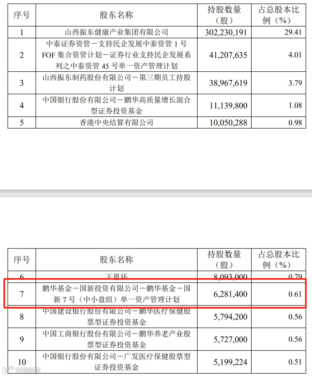 除了中国软件外,国新投资还介入了振东制药(300158)。振东制药2月7日收盘后的公告显示,截至2月5日,鹏华基金-国新投资-鹏华基金-国新 7 号(中小盘组)单一资产管理计划持有公司股票628.14万股,持股比例为0.61%,系公司第七大股东。截至2023年第三季度末,上述产品未进入振东制药前十大股东名单。