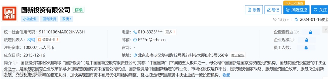 截至2022年底,国新控股资产总额近8600亿元;2022年净利润近240亿元。