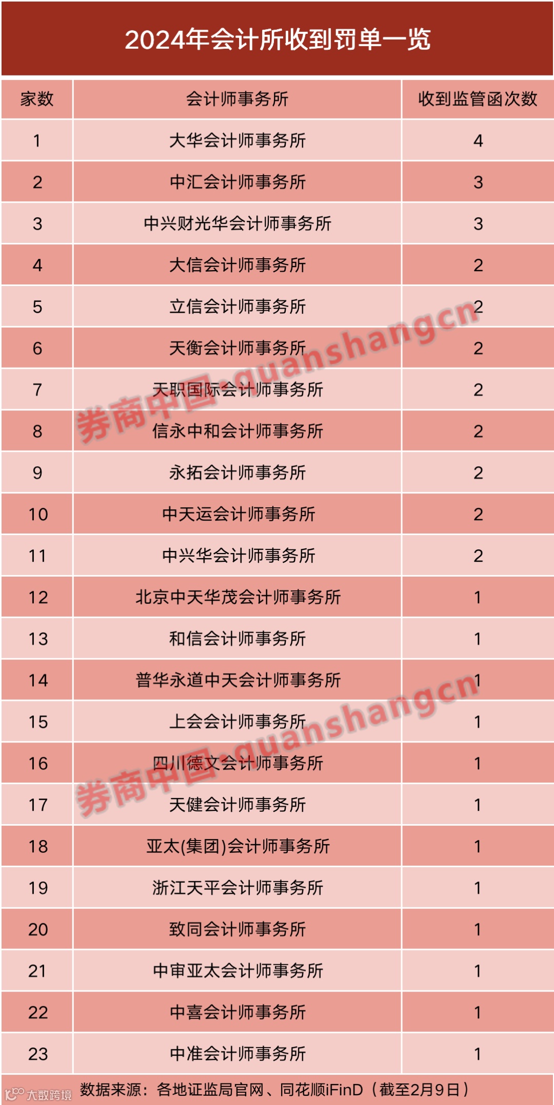 被罚会计所中,立信会计所、大华会计所等大所均在列。从违规情况看,年报审计未勤勉尽责成为监管关注重点。