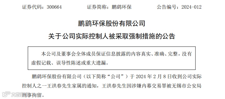 2月8日晚间,鹏鹞环保(300664)公告,公司于当日收到实际控制人之一王洪春家属的通知,王洪春因涉嫌内幕交易罪被无锡市公安局刑事拘留。
