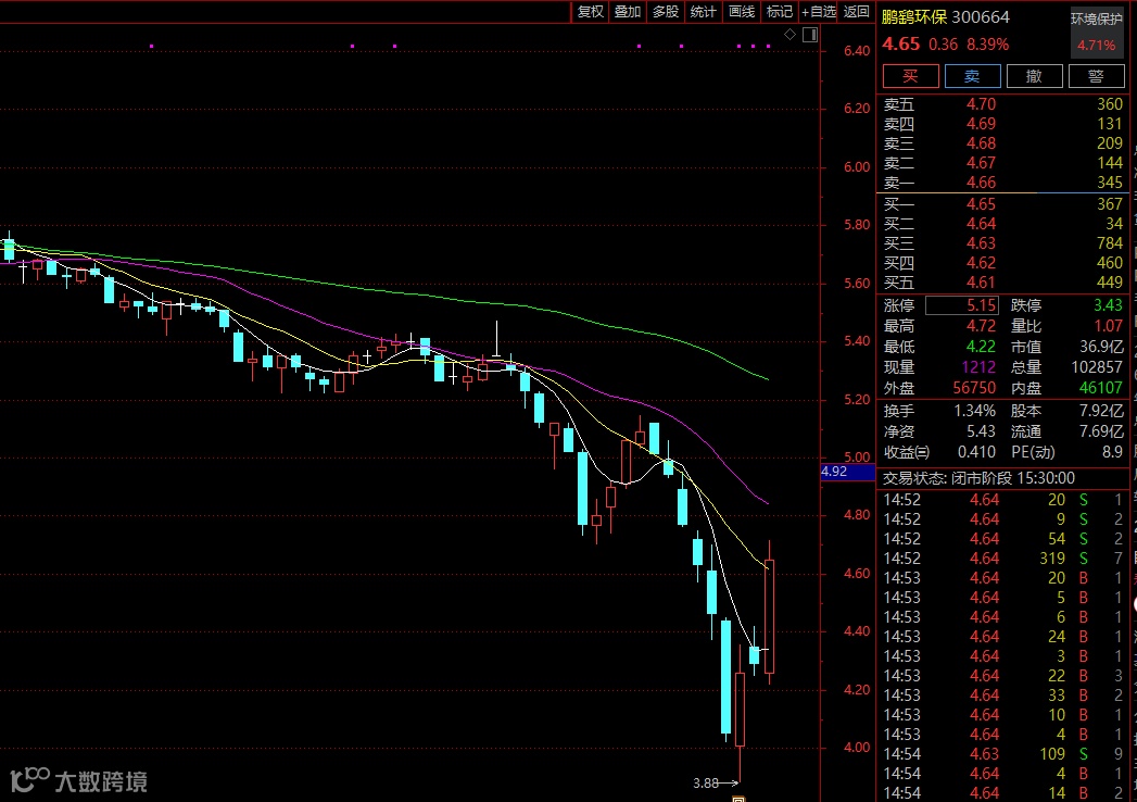 2月8日,鹏鹞环保股价大涨逾8%,收报4.65元/股,当前总市值约37亿元。