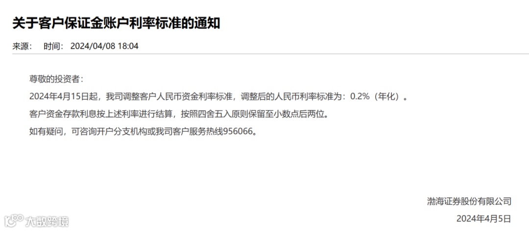 4月8日,渤海证券发布了《关于客户保证金账户利率标准的通知》。通知称,2024年4月15日起,公司调整客户人民币资金利率标准,调整后的人民币利率标准为:0.2%(年化)。客户资金存款利息按上述利率进行结算,按照四舍五入原则保留至小数点后两位。