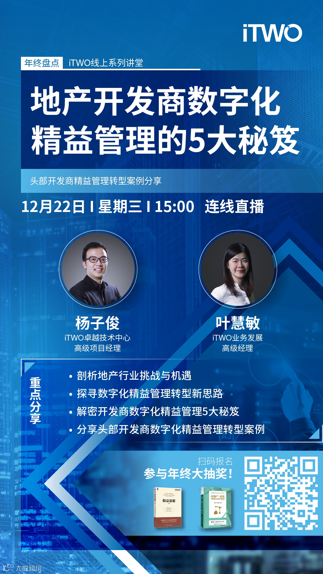 2021年终盘点,诚邀您参与12月22日下午15点iTWO线上讲堂,从数字化技术角度探讨如何在地产项目开发和建造上更加精益。