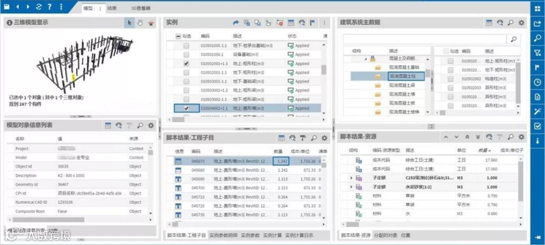 在计价模块中,实现基于模型构件级别的算量结果来进行套价,然后关联工程量清单结构。在整个计价过程中,通过引入一个核心元素——“工程子目”,使得工程量清单条目、模型构件、定额条目以及定额条目对应的人材机资源实现实时关联,大幅度提高计价管理水平。