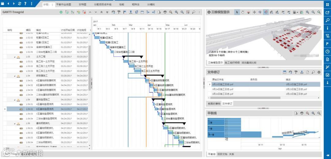 通过模型与施工组织条目和相关文档关联,既可以实现现场施工组织可视化交底,也实现施工组织可视化管理,快速生成4D模拟,以及平台提供的平衡作业线图功能,提前检查施工过程中资源调配的冲突。因为平台基于BS架构,可以通过移动端在现场录入完工进度数据,实现实时同步完工进度,优化管理。
