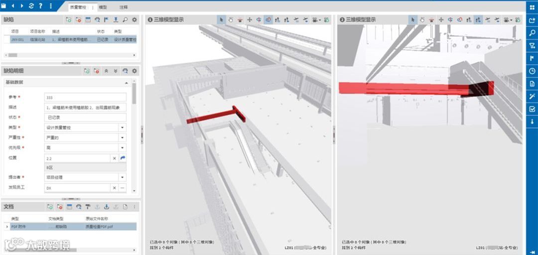 对于该类大型工程另外一个重中之重的管理要点,就是现场检查安全质量问题的审核流程。对于现场存在的安全隐患以及质量问题,在检查期间,必须记录其发现时间,优先级、严重度、提出人、负责人、现场位置、现场图片或其他现场数据,相关的施工组织计划,并且与模型构件关联等,在平台中形成问题库和隐患库统一管理。