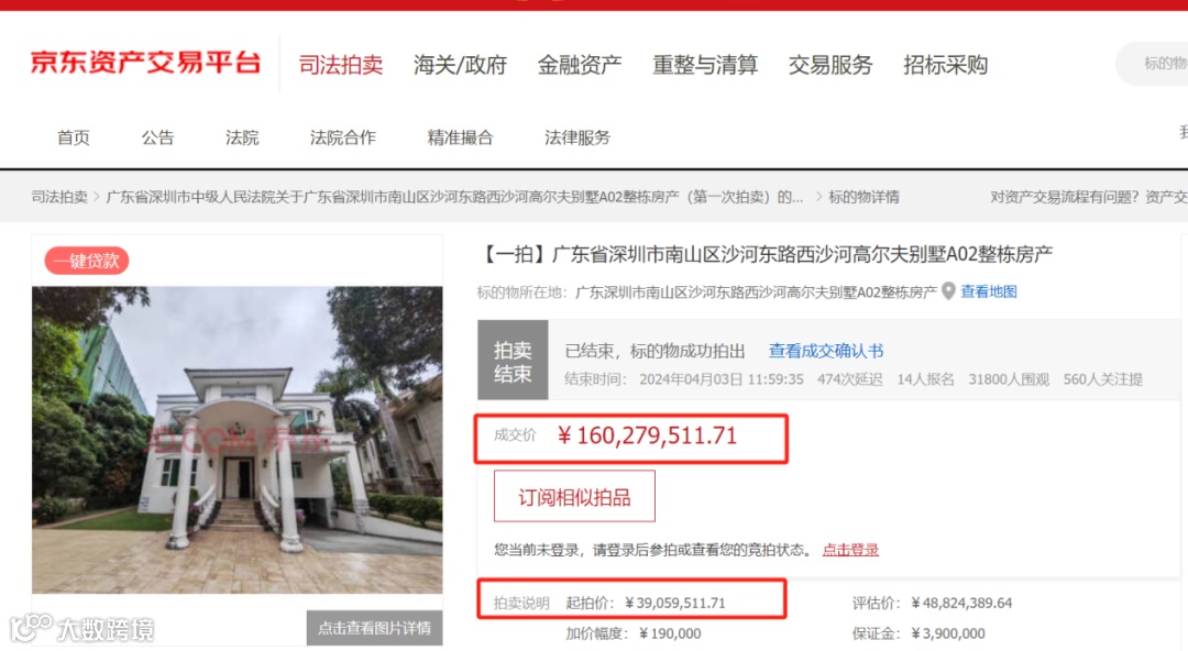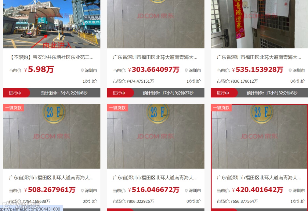 根据京东资产平台发布的信息,最后成交的溢价率都非常高。具体如下:香蜜湖水榭花都204.9平起拍价2922万元,成交价4126万元,均价超过20万/平方米;香蜜湖一号319.7平起拍价3091万元,成交价6417万元,均价亦超20万/平方米;深圳湾瑞府(公寓)398平起拍价5768万元,成交价7401万元;纯水岸联排别墅起拍价8280万元,成交价1亿元;沙河高尔夫独栋别墅起拍价3906万元,成交价1.6亿元,溢价率超过300%。