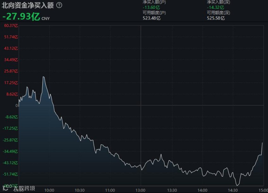 北向资金午后一度净卖出超60亿元,不过在尾盘30分钟回流超30亿元。最终,北向资金全天净卖出27.93亿元。其中,沪股通净卖出13.6亿元,深股通净卖出14.32亿元。