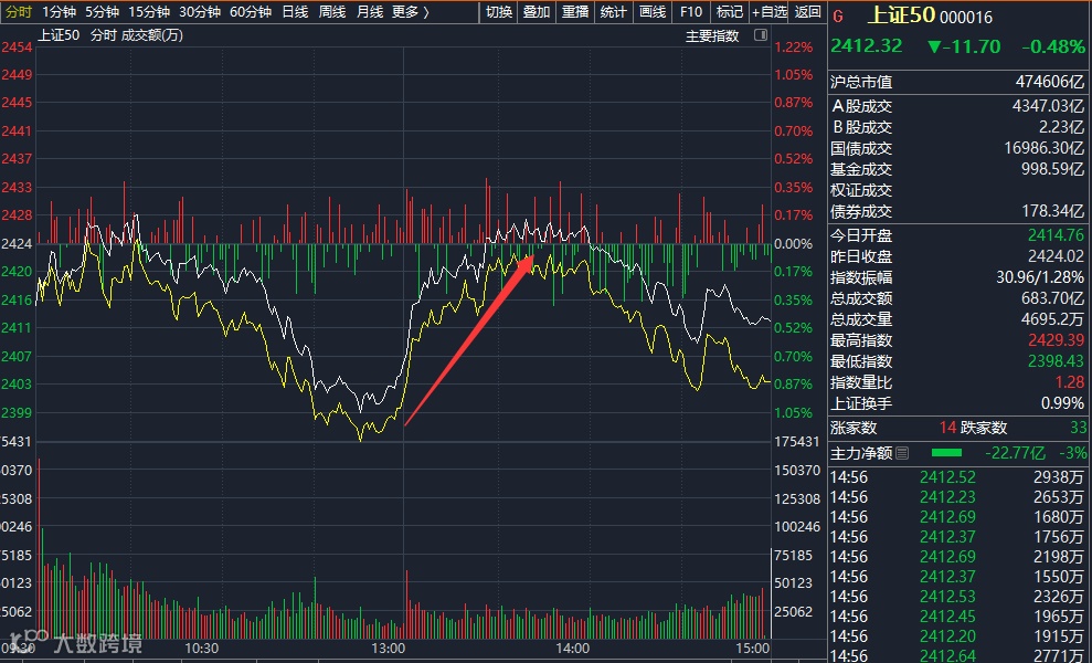 今日午后,A股一度出现异动,有不少资金抄底权重板块,上证50指数大幅拉升,午后20多分钟时间就翻红了,该指数早盘一度跌超1%。截至收盘时,上证50指数跌0.48%,沪指跌1.65%,深成指跌2.29%,创业板指跌1.97%。沪深两市全天成交额合计9471亿元,较上一交易日缩量500亿元。